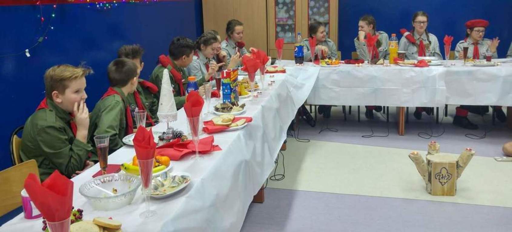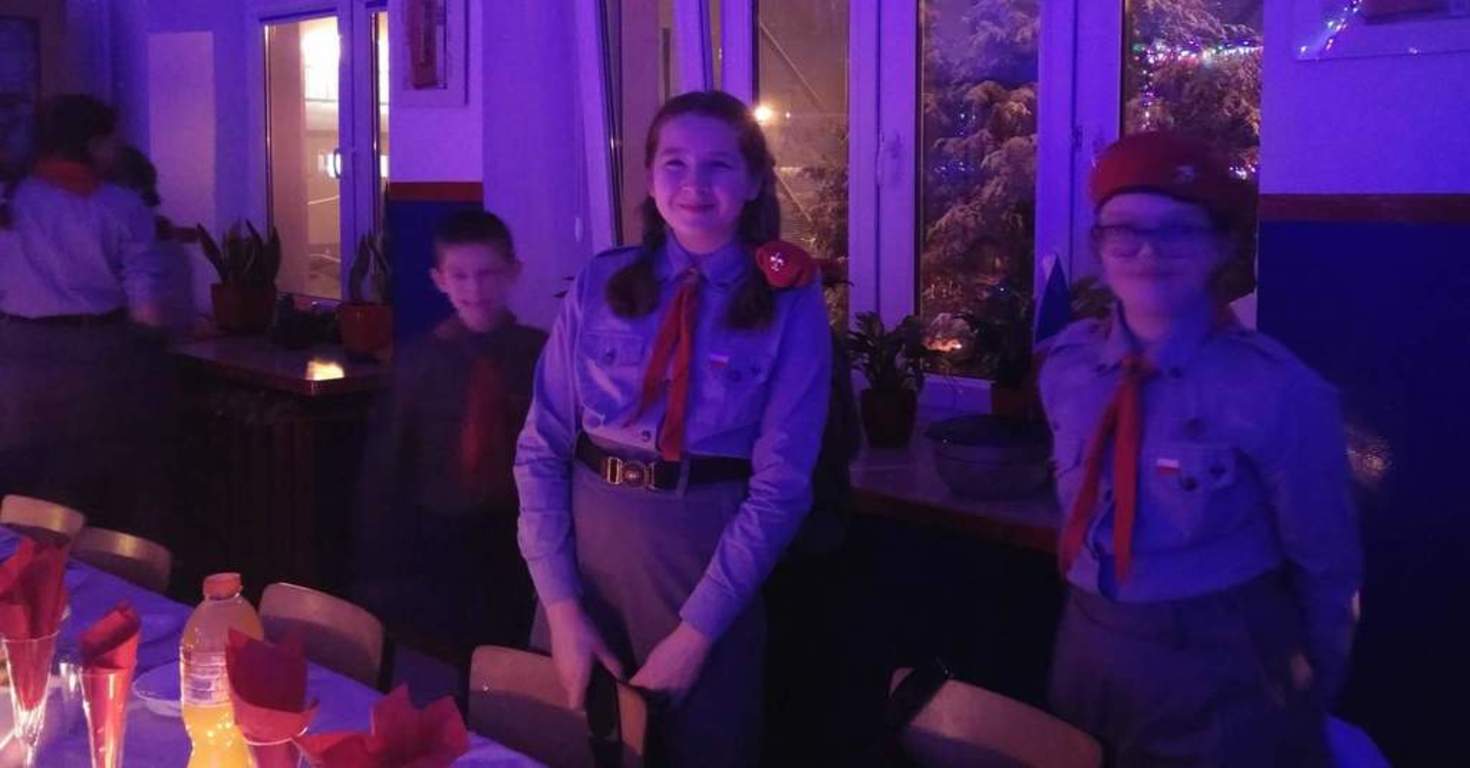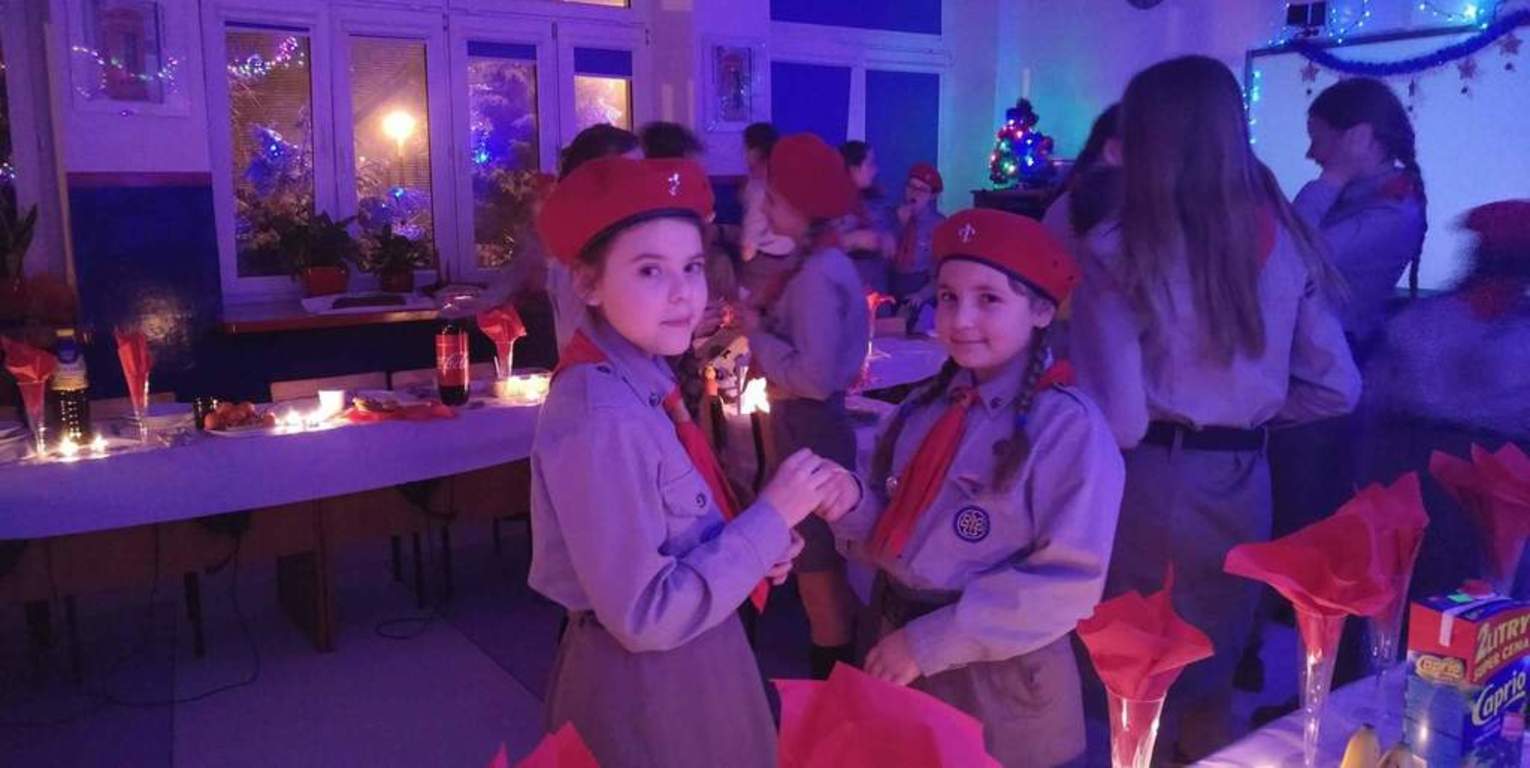 21 grudnia cała nasza harcerska rodzina zebrała się, aby wspólnie spędzić chwile w radosnej atmosferze oczekiwania na Boże Narodzenie. Wspólnie z panią dyrektor Renatą Nowak rozpaliliśmy harcerski kominek, podzieliliśmy się opłatkiem i zaśpiewaliśmy kolędy, a dzięki pomocy naszych nieocenionych mam zasiedliśmy do wigilijnego stołu, gdzie czekały na nas wyborne pierogi, tradycyjna sałatka jarzynowa oraz pachnące pierniczki. Wieczór spędziliśmy w wyjątkowej atmosferze