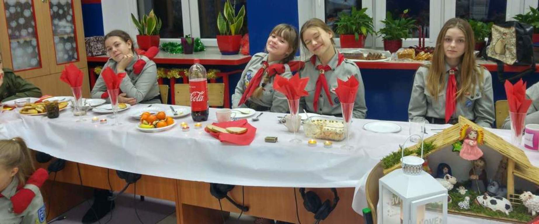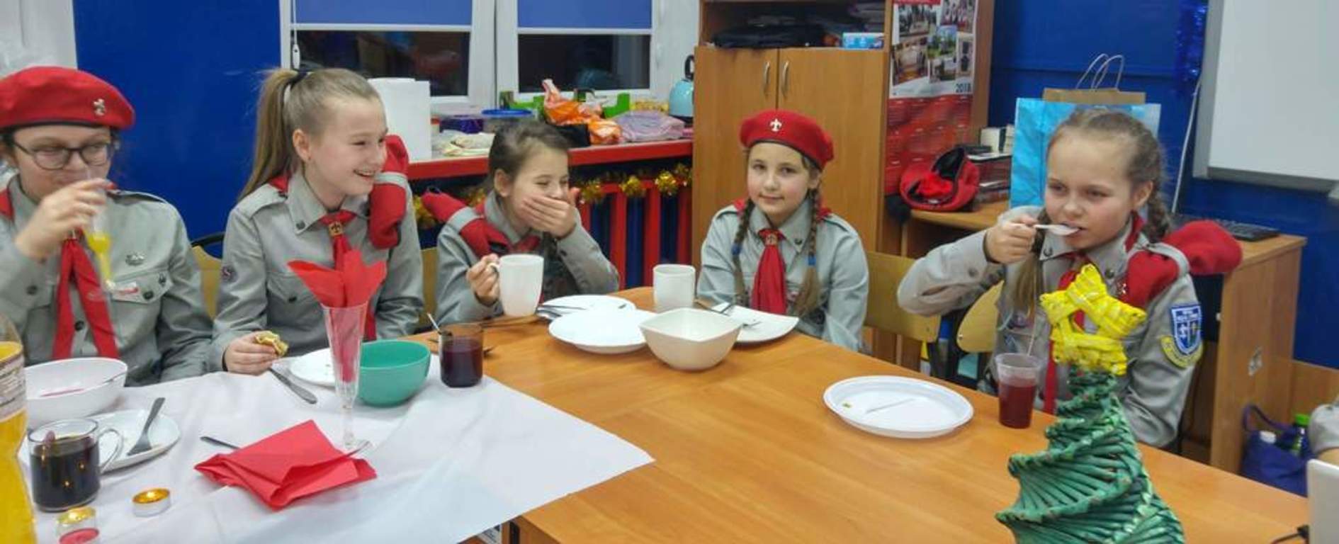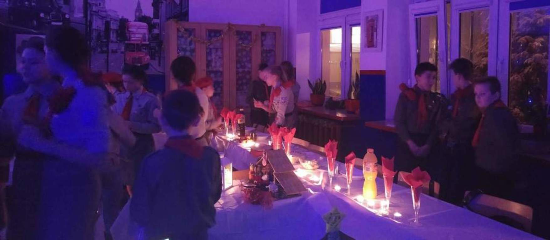 21 grudnia cała nasza harcerska rodzina zebrała się, aby wspólnie spędzić chwile w radosnej atmosferze oczekiwania na Boże Narodzenie. Wspólnie z panią dyrektor Renatą Nowak rozpaliliśmy harcerski kominek, podzieliliśmy się opłatkiem i zaśpiewaliśmy kolędy, a dzięki pomocy naszych nieocenionych mam zasiedliśmy do wigilijnego stołu, gdzie czekały na nas wyborne pierogi, tradycyjna sałatka jarzynowa oraz pachnące pierniczki. Wieczór spędziliśmy w wyjątkowej atmosferze