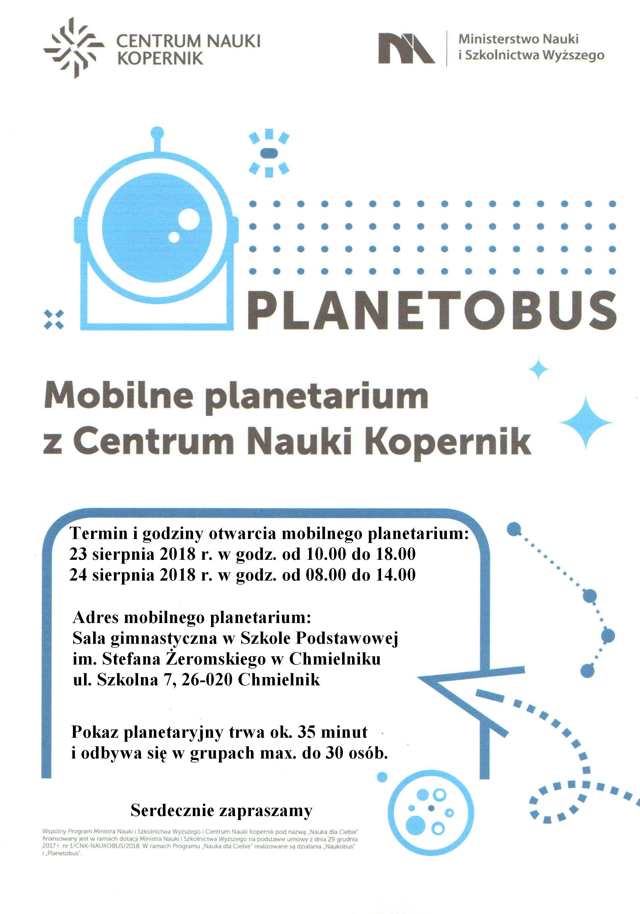 Serdecznie zapraszamy wszystkich uczniów, rodziców, nauczycieli do odwiedzenia Planetobusu- Mobilnego Planetarium, który zawita do naszej szkoły prosto z Centrum Nauki Kopernik. Pokazy planetaryjne będzie można oglądać w sali gimnastycznej w dniach 23 sierpnia 2018 r. w godzinach od 10.00 do 18.00 oraz 24 sierpnia 2018 r. w godzinach od 08.00 do 14.00. Pokaz trwa ok. 35 minut i będzie się odbywał w grupach max. do 30 osób.
