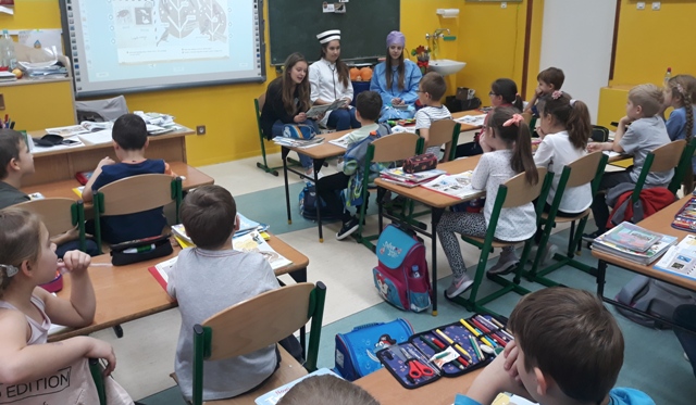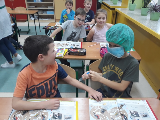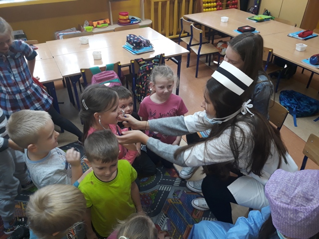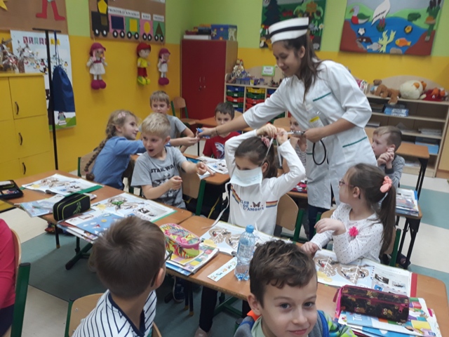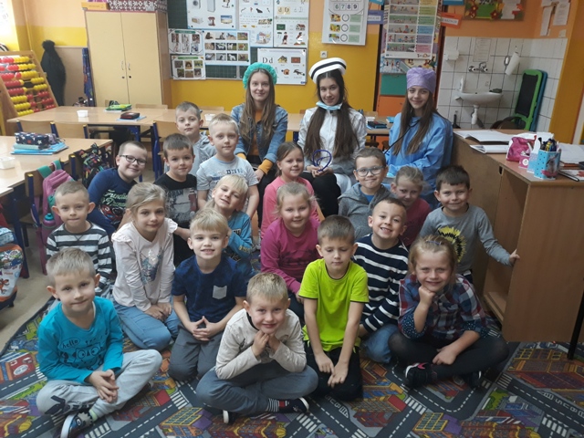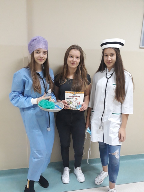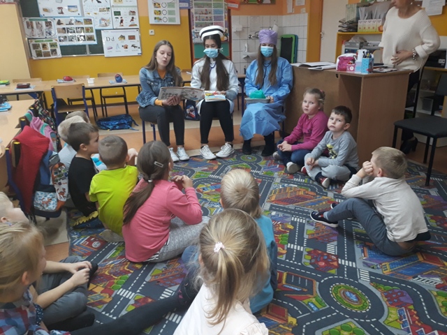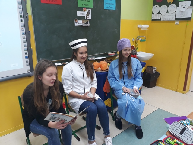 19 listopada br. uczniowie gimnazjum rozpoczęli w naszej szkole kolejny cykl spotkań czytelniczych pn. „Gimnazjaliści czytają dzieciom”. Ta edycja akcji promującej głośne czytanie najmłodszym połączona jest z preorientacją zawodową. Ma ona na celu wstępne zapoznanie dzieci z wybranymi zawodami oraz pobudzenie i rozwijanie ich zainteresowań i uzdolnień. Aby osiągnąć zamierzony cel, uczennice: Karolina Dąbrowska, Julia Wysocka i Patrycja Zychowicz, ubrane w strój pielęgniarek, zaopatrzone w podstawowe narzędzia ich pracy, odwiedziły oddziały zerówek w szkole podstawowej, prezentując im historię pielęgniarki Zosi, bohaterki książki Ralfa Butschkowa pt. „ Mam przyjaciółkę pielęgniarkę”. Jak działa izba przyjęć? Co robią pielęgniarki i jakie są ich podstawowe narzędzia pracy? Dlaczego na sali operacyjnej musi być bezwzględnie czysto? I co to jest właściwie promieniowanie rentgenowskie? Na te i inne pytania najmłodsi uzyskali odpowiedzi, uczestnicząc w tym owocnym dla wszystkich spotkaniu. Akcja prowadzona jest obecnie w klasach 1 - 3 szkoły podstawowej.