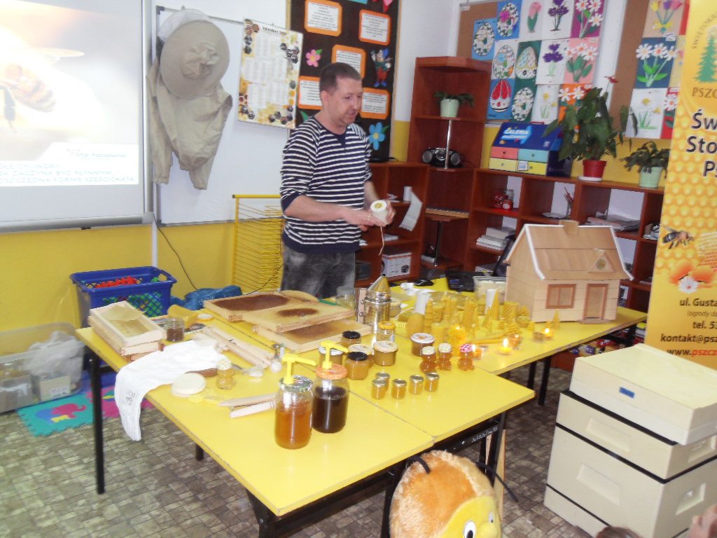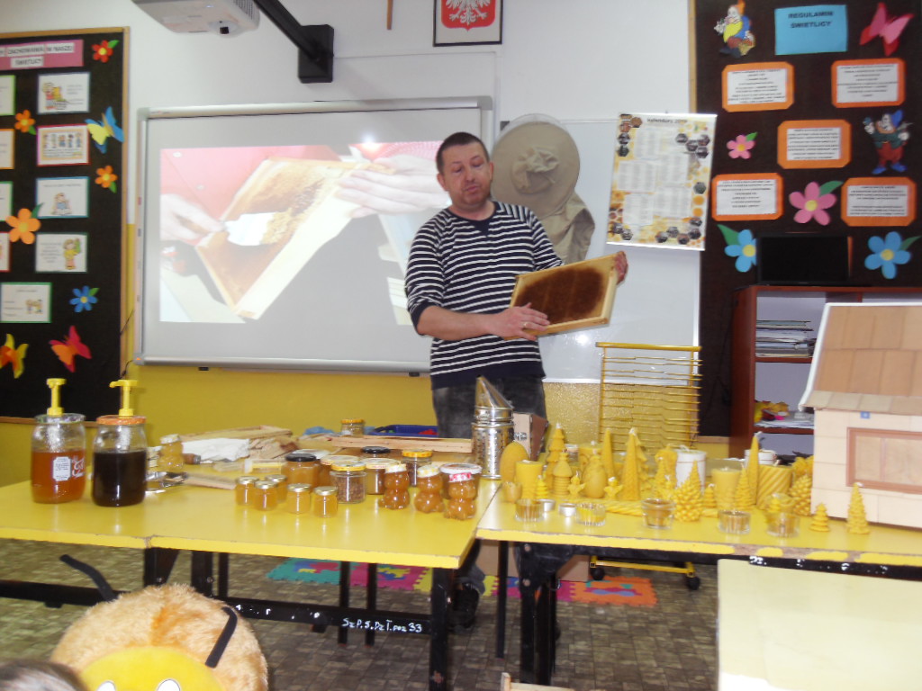 29.04.2019 r. w Szkole Filialnej w Suchowoli odbyło się spotkanie z wykonującym zawód pszczelarza panem Tomaszem Dyragą, należącym do Świętokrzyskiego Stowarzyszenia Pszczelarzy. Spotkanie obejmowało prezentację multimedialną o strukturze pszczół w ulu, a konkretnie o zadaniach, jakie mają do wykonania poszczególni członkowie tego środowiska przyrodniczego. Ponadto pan Tomasz zaprezentował różne rodzaje miodów jako podstawowych produktów pszczelich oraz mleczko pszczele, pierzgę pszczelą, przepiękne świeczki wyrabiane z wosku pszczelego i akcesoria pszczelarskie, m.in. odzież do pracy w pasiece. Dzieci dowiedziały się też o ogromnym znaczeniu pszczół dla naszego środowiska naturalnego i zdrowia człowieka, a także wzięły udział w degustacji miodu, chętni zaś przymierzali część stroju pszczelarza – kapelusz.
