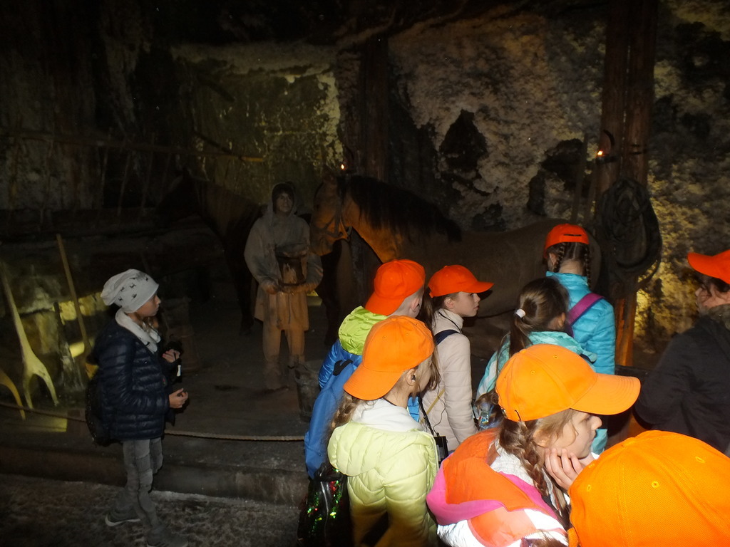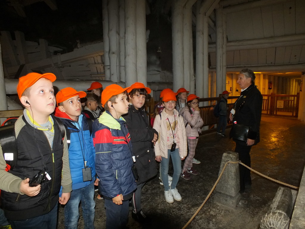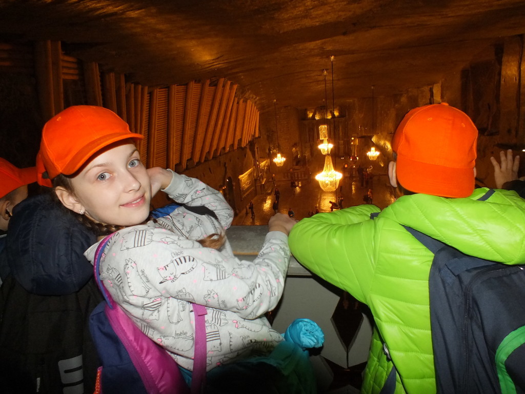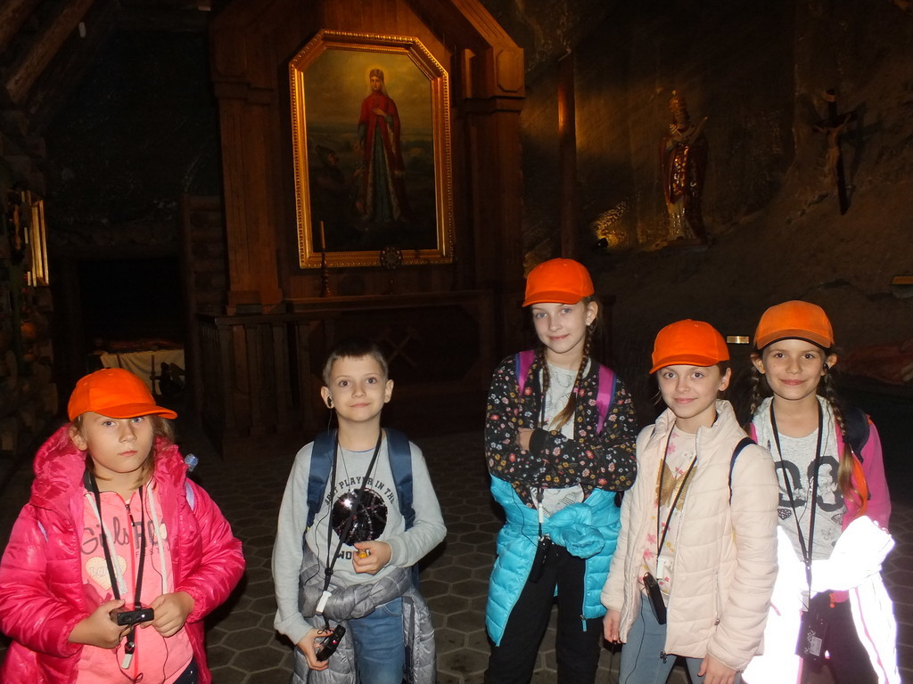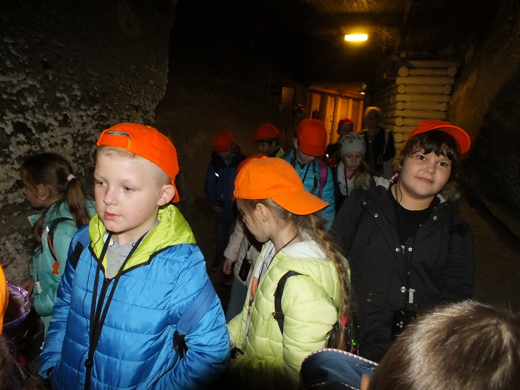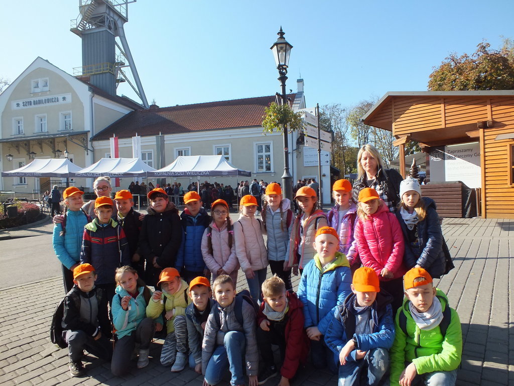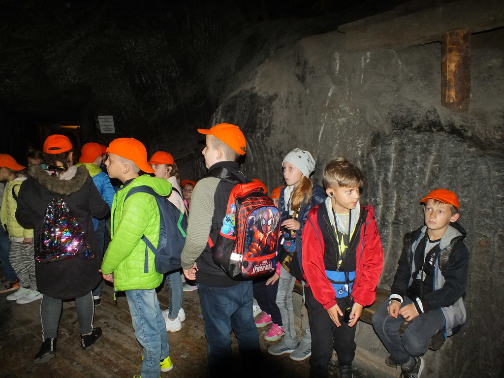 24 października uczniowie klasy 3a wybrali się na wycieczkę do niezwykłej Kopalni Soli w Wieliczce. Przed wejściem na podziemną trasę turystyczną mieliśmy chwilę czasu na zakup pamiątek. Przed rozpoczęciem zwiedzania dostaliśmy indywidualny zestaw nagłaśniający, aby lepiej słyszeć przewodnika. Pierwszym wyzwaniem było zejście po schodach, których było… 800, z czego na starcie już 380. Gdy zeszliśmy na głębokość 135 metrów, zrobiło się dość zimno, podczas gdy na zewnątrz panowała piękna, jesienna pogoda. Zabawną atrakcją, przez całą trasę, była możliwość sprawdzania, czy ściany są rzeczywiście z soli. W kopalni usłyszeliśmy m.in. legendę o św. Kindze, ale przede wszystkim zobaczyliśmy niesamowite wnętrza z rzeźbami wykutymi w soli, wspaniałe kaplice, urokliwe podziemne jeziorka, oryginalne urządzenia i sprzęt, a także ślady prac górniczych, które dały maluchom wyobrażenie o zmaganiach ludzi z żywiołem, ich pracy, wierzeniach. Zwiedzanie zakończyliśmy przepysznym posiłkiem w restauracji ,,Smakuj pod ziemią”. Pobyt w kopalni okazał się niezwykłą przygodą, interesującą lekcją oraz świetną zabawą.