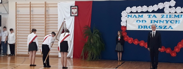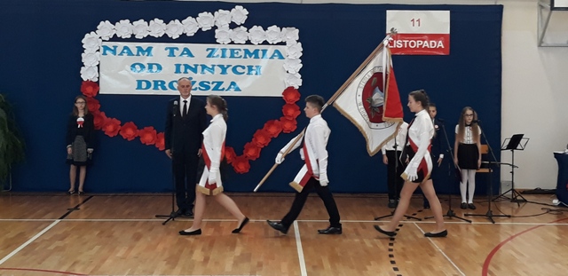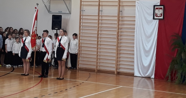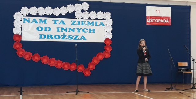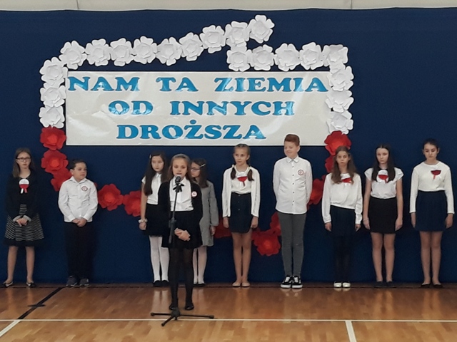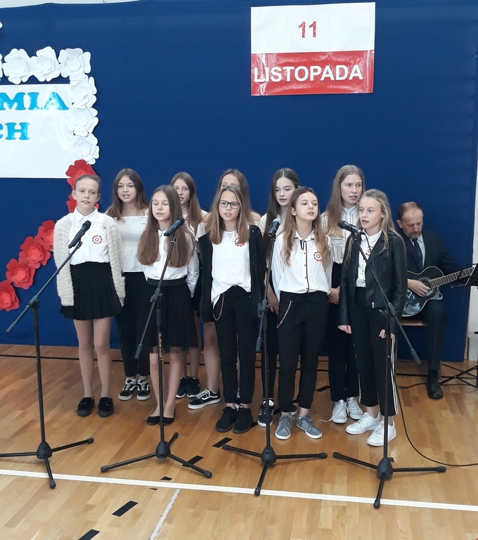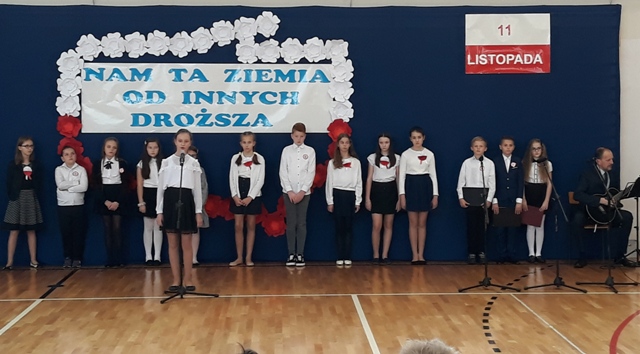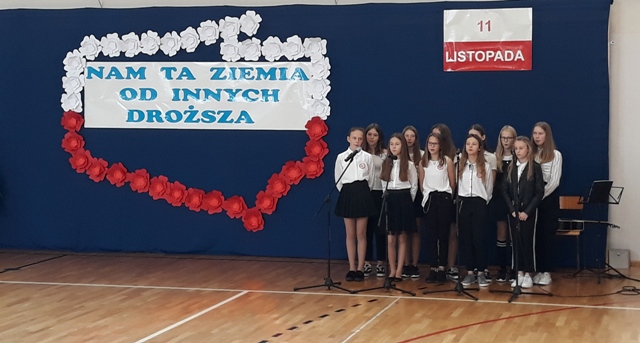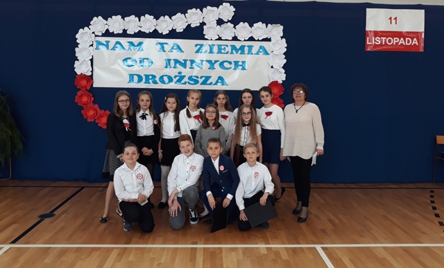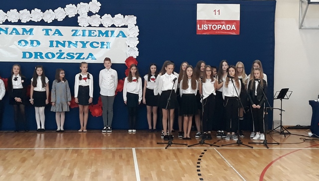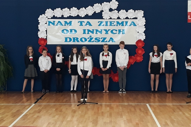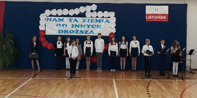 Oto motto przewodnie obchodów Narodowego Święta Niepodległości w naszej szkole. Najpiękniejszymi słowami tych, którzy umiłowali Ojczyznę, słowami poetów, uczniowie opowiedzieli o Niej i o Polakach. Wyśpiewali także historie o ułanach, piechocie, legionach łączące się w jedną pieśń – pieśń zwycięstwa i niepodległości. Obecni z powagą i skupieniem uczestniczyli w tym patriotycznym wydarzeniu, którego zwieńczeniem było odśpiewanie Hymnu Państwowego o symbolicznej godzinie 11.11.