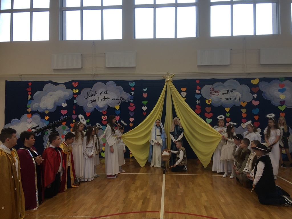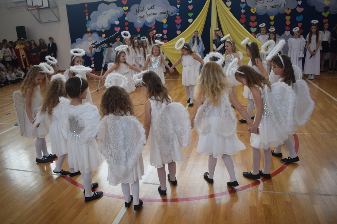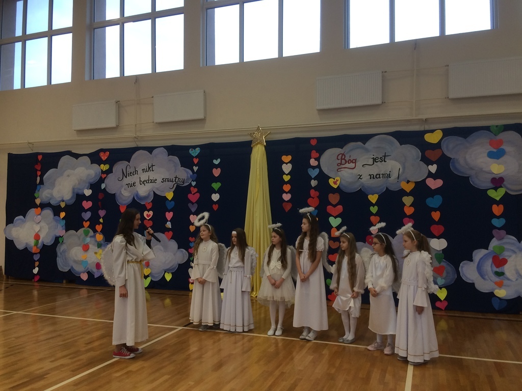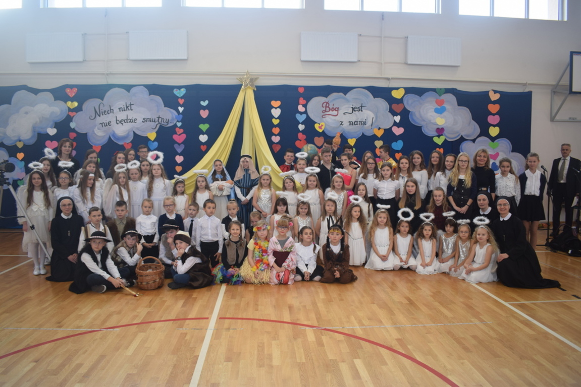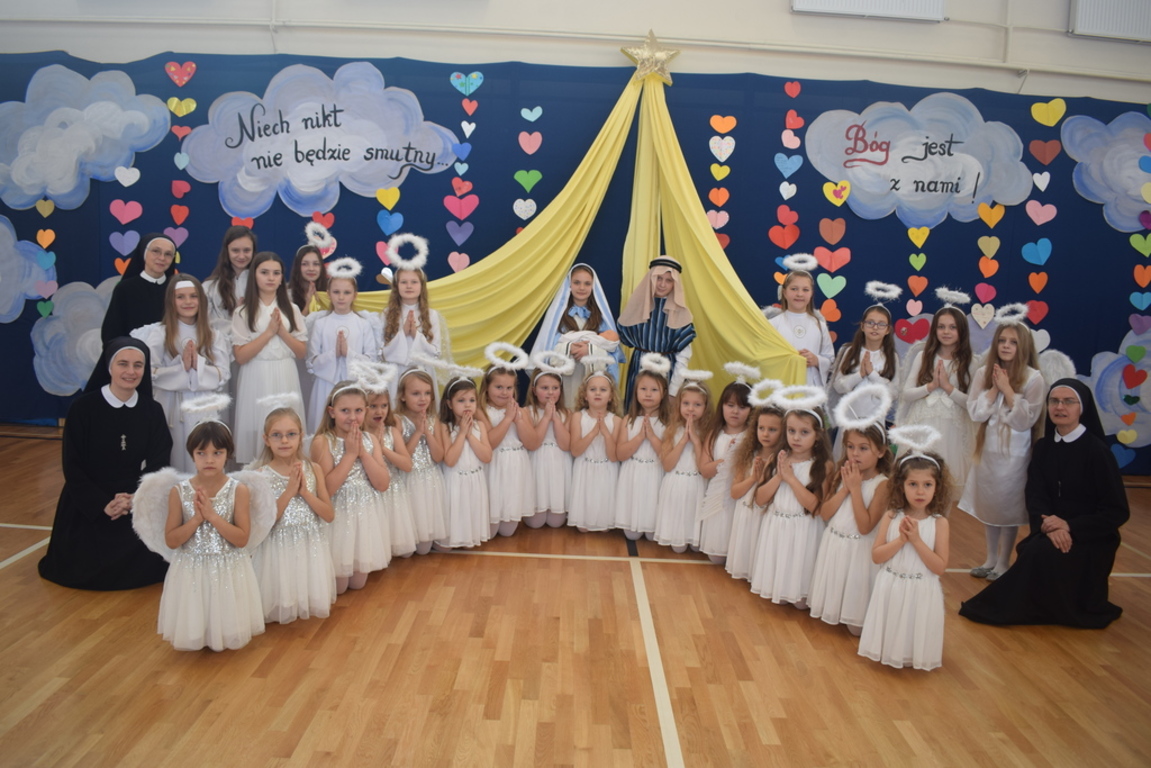 Na głębsze przeżywanie Tajemnicy Bożego Narodzenia przygotowały nas szkolne Jasełka, które odbyły się 20 grudnia w sali gimnastycznej. Główne przesłanie scenariusza to pobudzenie widza do radości wynikającej z prawdy, że Bóg jest między nami, tak by zechciał przybyć do Narodzonego. Do tego było potrzebnych wielu aniołów. Ich role odegrały uczennice z różnych klas, a najmłodsze 6-latki wykonały przecudny anielski taniec. Warto podkreślić, że wykonawcami Jasełek byli uczniowie naszych katechetek: s. Gracjany, s. Damarii, s. Konstancji i p. Marzeny Kaszy. Podczas przedstawienia uczniowie zaprezentowali talenty nie tylko aktorskie i teatralne, ale również wokalne, muzyczne i taneczne. Co ciekawe, do dekoracji zostały użyte kolorowe serca, które dzieci każdego dnia przynosiły do kościoła na Roraty. Całość Jasełek nie byłaby możliwa i tak efektowna, gdyby nie pomoc Rodziców i wielu nauczycieli. Podziękowania należą się:
