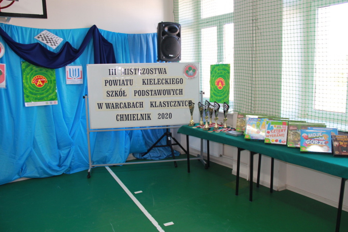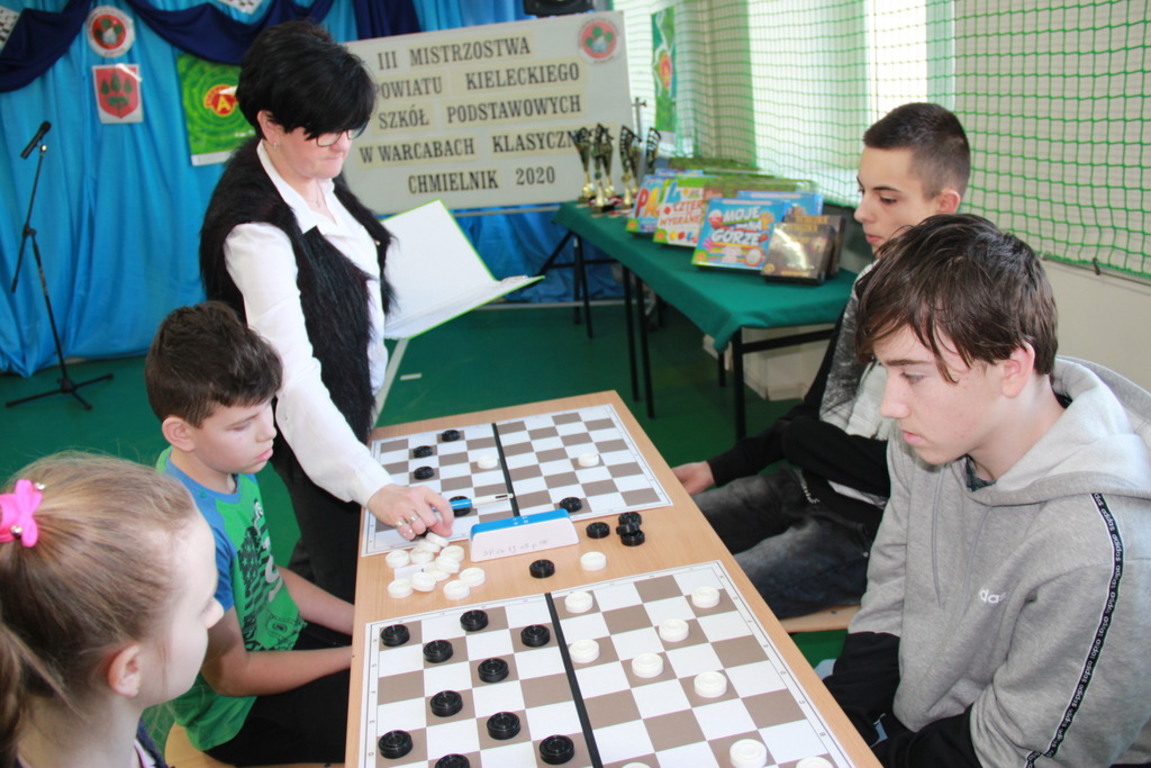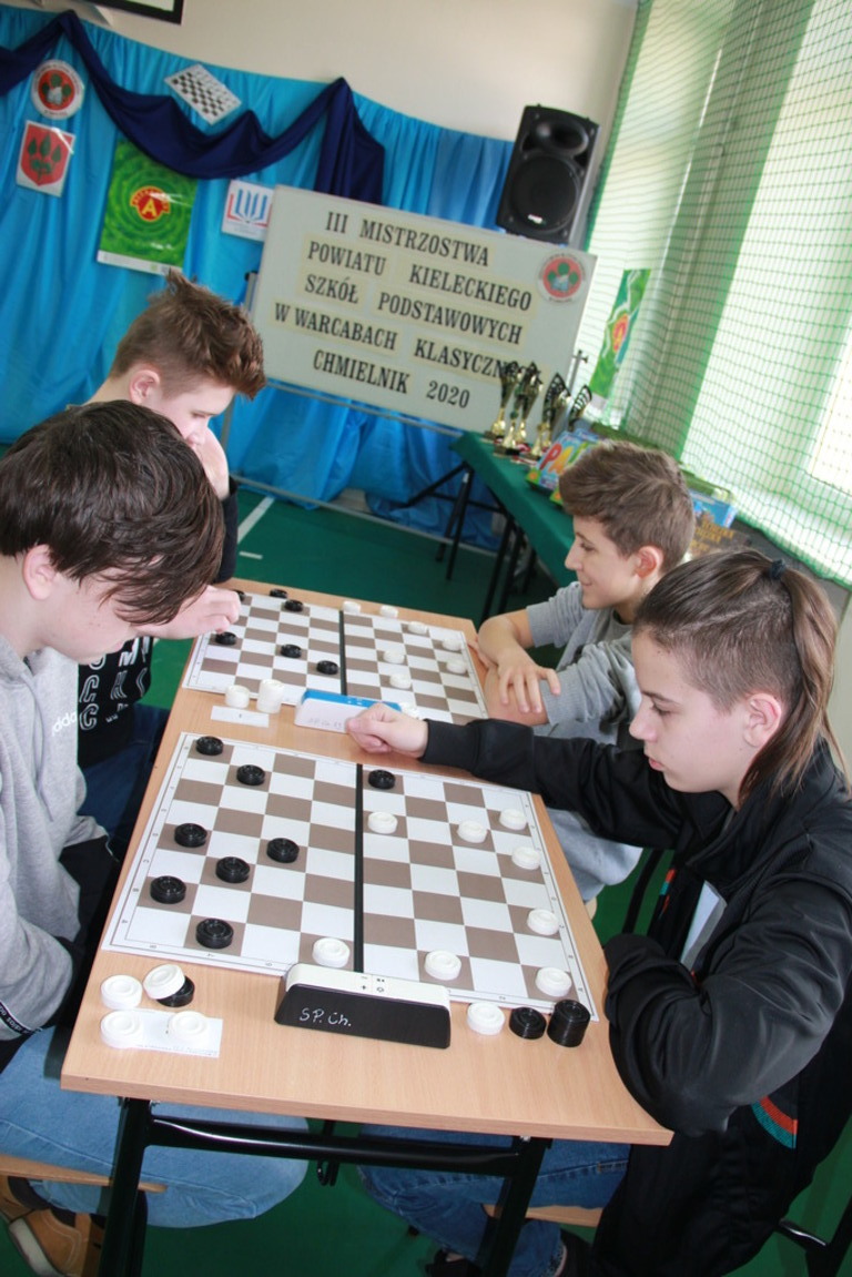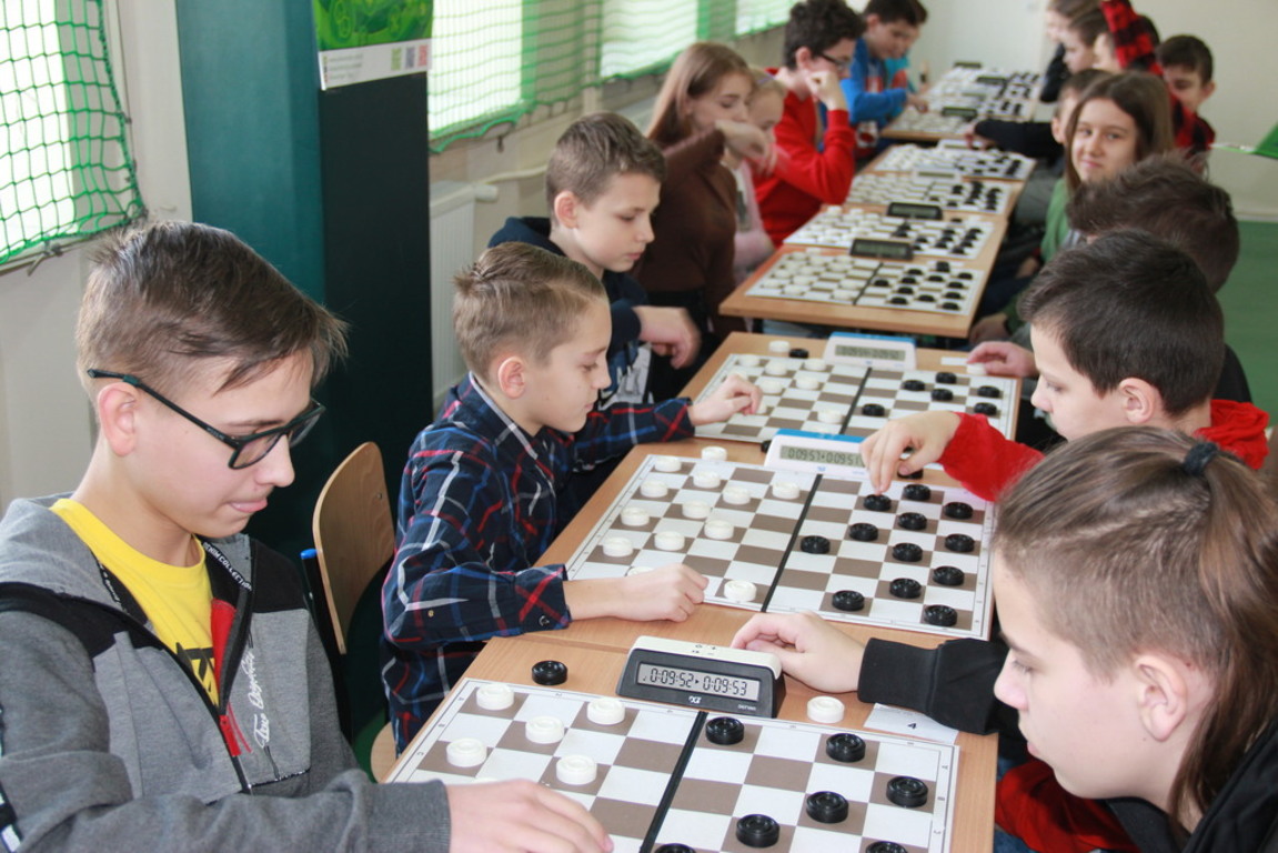 29 lutego br. w naszej Szkole odbyły się III Mistrzostwa Powiatu Kieleckiego Szkół Podstawowych w Warcabach Klasycznych. Głównym organizatorem imprezy był działający przy szkole Klub Gier Planszowych HEX, a patronatem objęli ją Kurator Świętokrzyski, Starosta Kielecki, Burmistrz MiG Chmielnik oraz Radio Kielce. W rozgrywkach wzięło udział ponad pięćdziesięciu uczniów z ośmiu szkół Powiatu Kieleckiego. Zawody zostały przeprowadzone w dwóch kategoriach wiekowych, systemem szwajcarskim na dystansie siedmiu rund.
