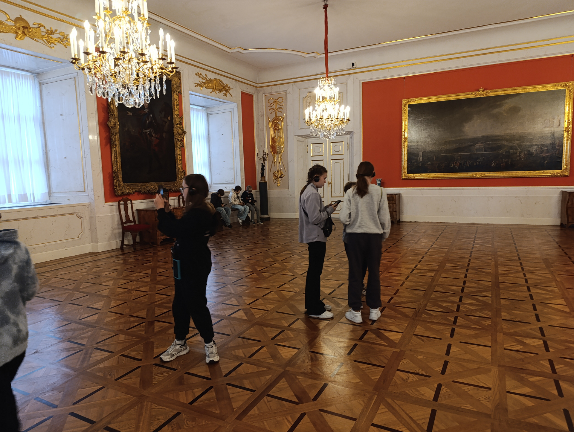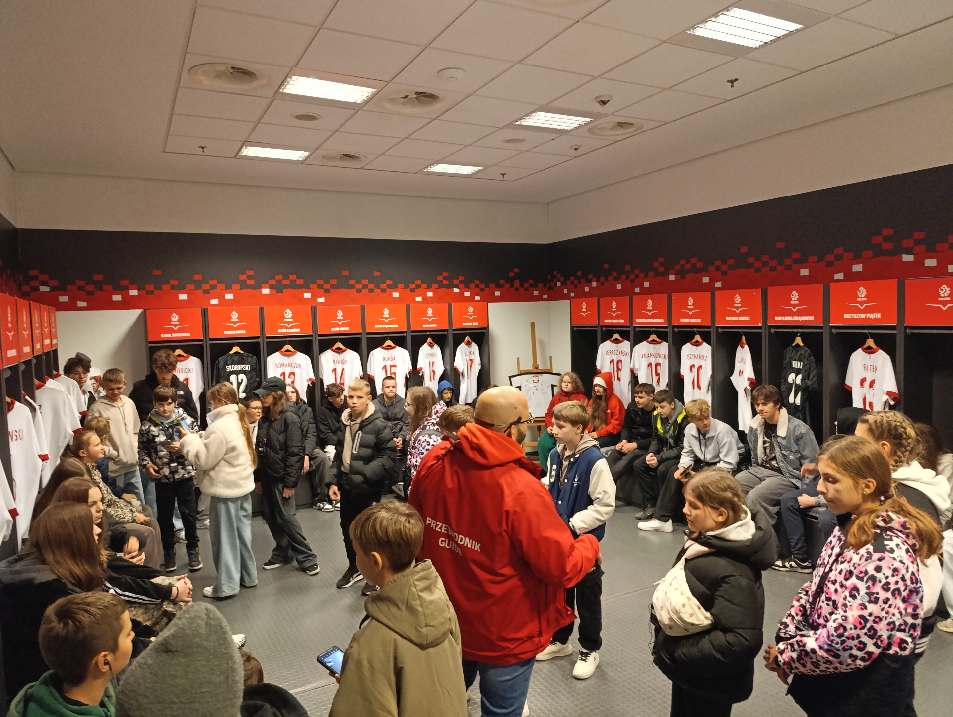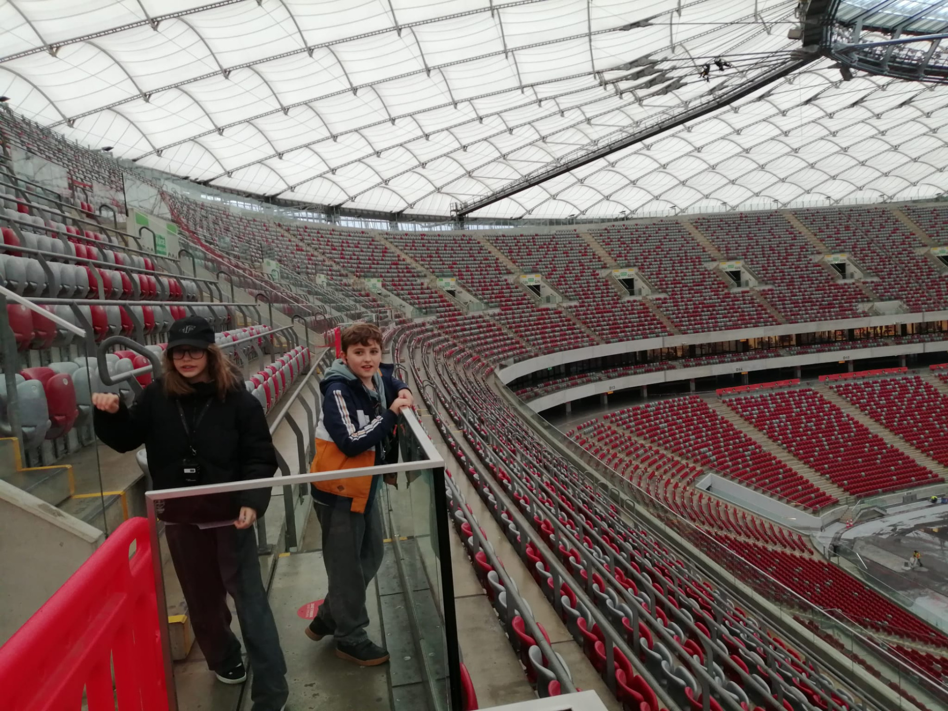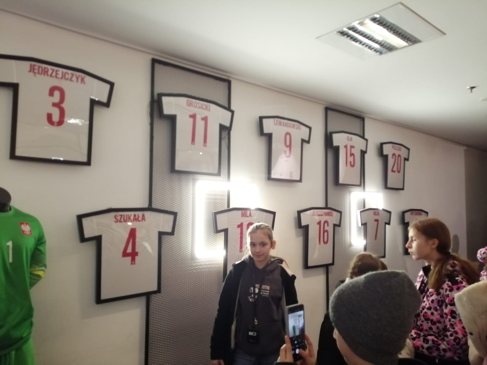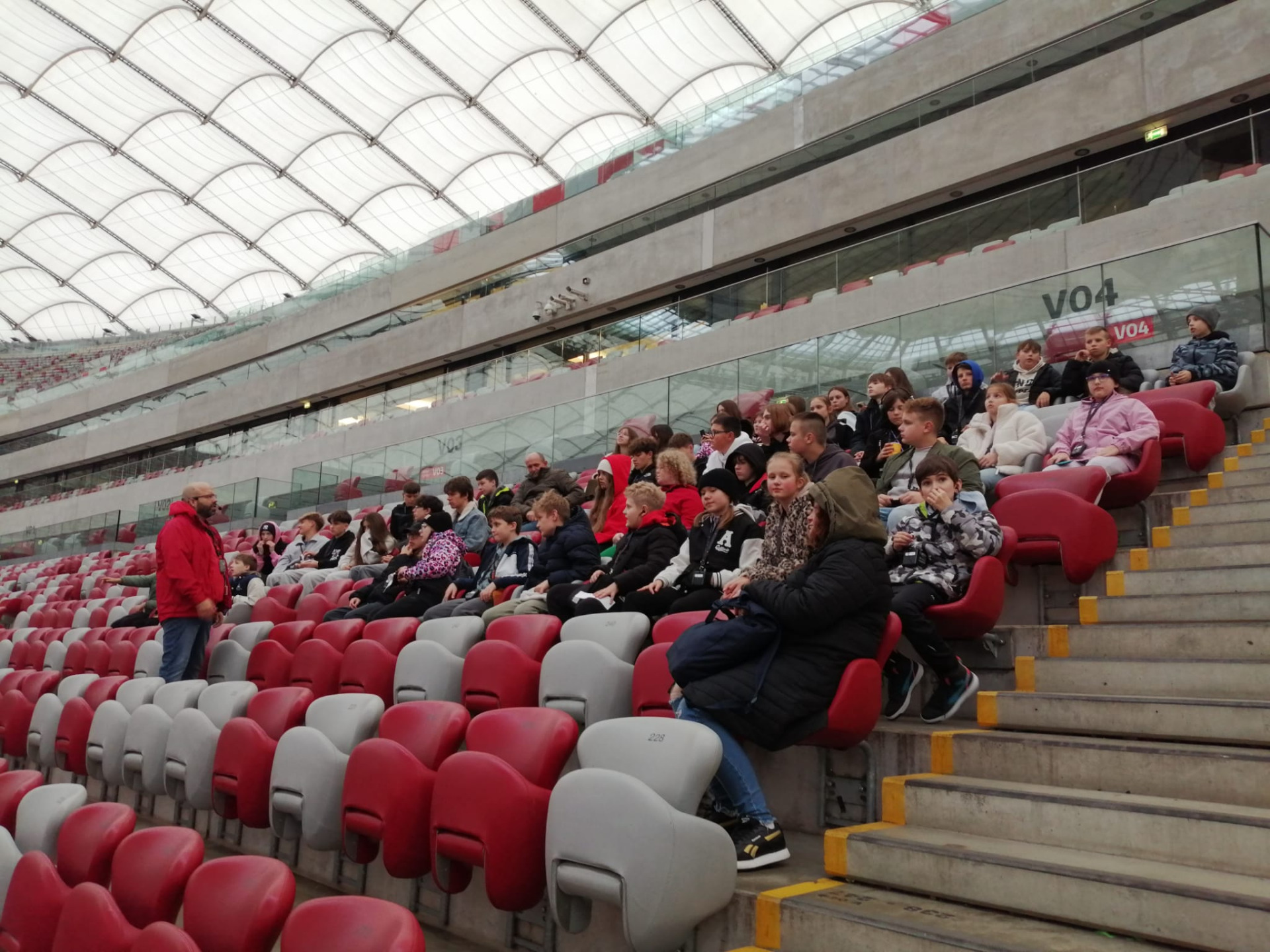 Następnie przeszliśmy przez plac marszałka Józefa Piłsudskiego i udaliśmy się w stronę Krakowskiego Przedmieścia. Tam, przewodniczka zabrała nas na plan zdjęciowy do filmu „Lalka”. Z bliska mogliśmy podziwiać charakterystyczne warszawskie ulice, który posłużyły jako plan filmowy „Lalki”. Zdjęcia do produkcji nagrywano właśnie w tej okolicy. Było to nowe i niecodzienne doświadczenie, które na długo zapadnie nam w pamięć. Będąc już na Krakowskim Przedmieściu, weszliśmy do Bazyliki Świętego Krzyża, gdzie zgodnie z życzeniem- ostatnią wolę spełnił Fryderyk Chopin, którego serce znajduje się właśnie w tym miejscu. Chwilę później wyruszyliśmy w stronę Starego Miasta, Rynku Starego Miasta by tam, obok pomnika warszawskiej Syrenki spotkać ostatniego, warszawskiego kataryniarza - pana Jana. Po krótkiej prezentacji instrumentu i pamiątkowym zdjęciu, udaliśmy się na Barbakan, a potem pod Pomnik Małego Powstańca. Przez całą swoją opowieść o Warszawie, pani przewodnik ciekawie łączyła przeszłość z teraźniejszością, wplatatając w nią opowiadanie o bohaterach „Kamieni na szaniec” Aleksandra Kamińskiego. Przedostatnim punktem naszego zwiedzania była wizyta w Zamku Królewskim. Przepiękne wnętrza obiektu urzekły wszystkich. Dowiedzieliśmy się, że w Zamku Królewskim w latach 30. XX wieku mieszkał patron naszej Szkoły – Stefan Żeromski. Po opuszczeniu zamku wybraliśmy się na smaczny i pożywny posiłek, po czym wsiedliśmy do autobusu i z jego okien podziwialiśmy Aleje Ujazdowskie, budynki ambasad innych krajów, Sejm i Senat. Niezwykle ciekawym miejscem dla uczestników wycieczki była wizyta na stadionie PGE Narodowym. Z racji tego, że było wśród nas wielu kibiców piłki nożnej, wizyta w tym miejscu była spełnieniem marzeń. Obiekt, zarówno z zewnątrz i wewnątrz jest ogromny i naprawdę robi wrażenie. W środku zwiedziliśmy trybuny, salę konferencyjną, hale biurowe oraz szatnię naszej kadry narodowej. Dowiedzieliśmy się wielu ciekawostek o tym, jak wygląda przygotowanie piłkarzy przed meczem i cała procedura po meczu.