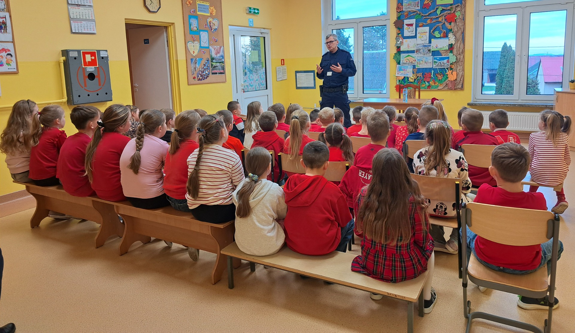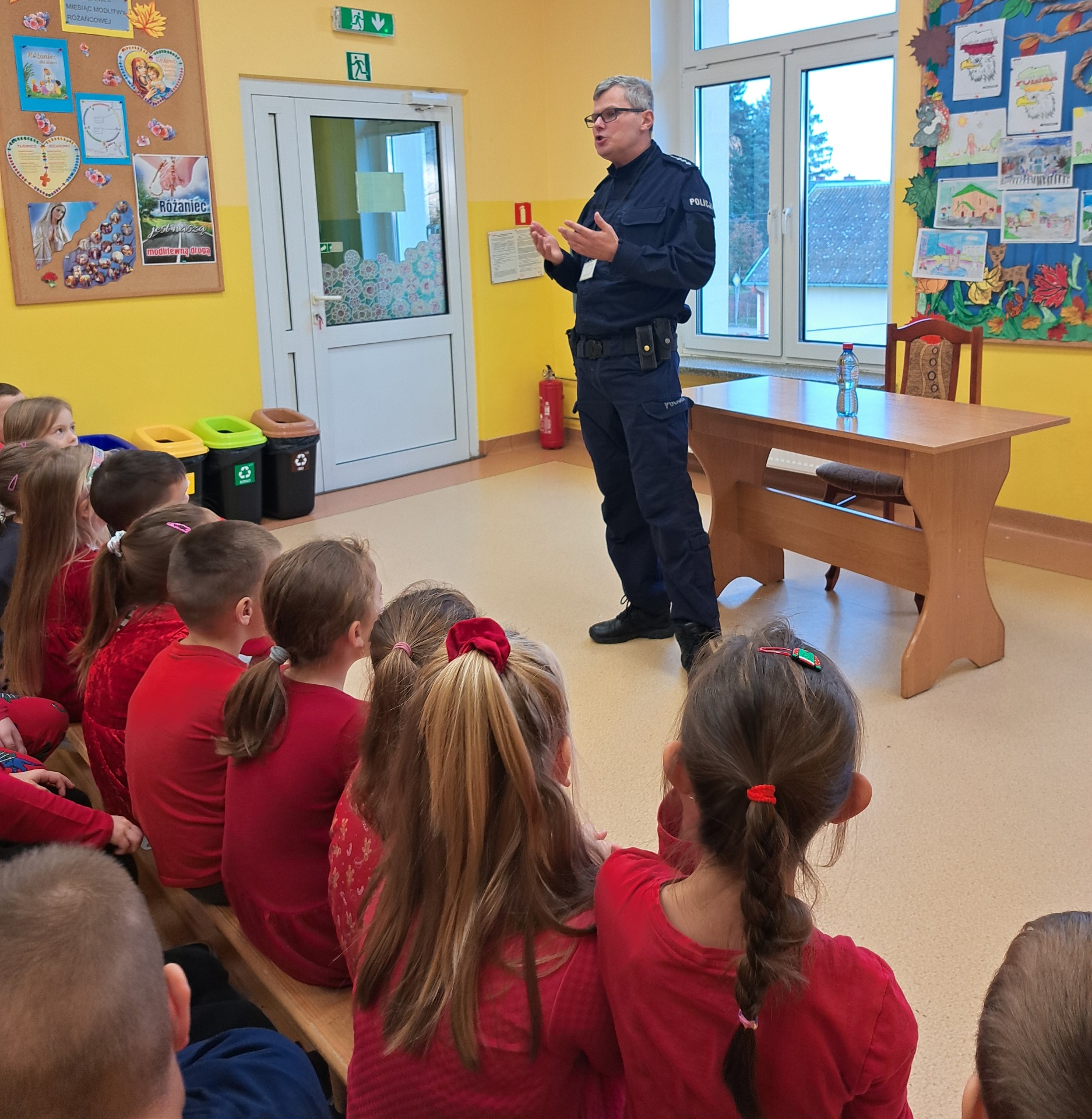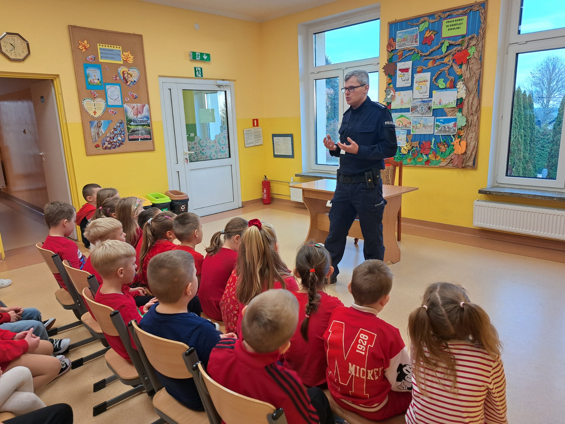 20 listopada 2025 r. w filii Suchowola odbyło się spotkanie z policjantem w ramach akcji „Świeć przykładem - noś odblaski". Spotkanie poprowadził dzielnicowy Komisariatu Policji w Chmielniku st. asp. Mariusz Pawłowski. Celem wizyty było zwróceniem uwagi, że bardzo ważnym elementem zwiększającym bezpieczeństwo na drodze jest noszenie na sobie elementów odblaskowych. Policjant przeprowadził również z uczniami rozmowę na temat rodzajów przemocy i agresji występujących w środowisku szkolnym i internecie oraz jej konsekwencji prawnych. Odniósł się także do akcji „Dzień na czerwono" - przeciwdziałanie przemocy dorosłych wobec dzieci. Dzieci były aktywne na spotkaniu, zadawały dużo pytań.