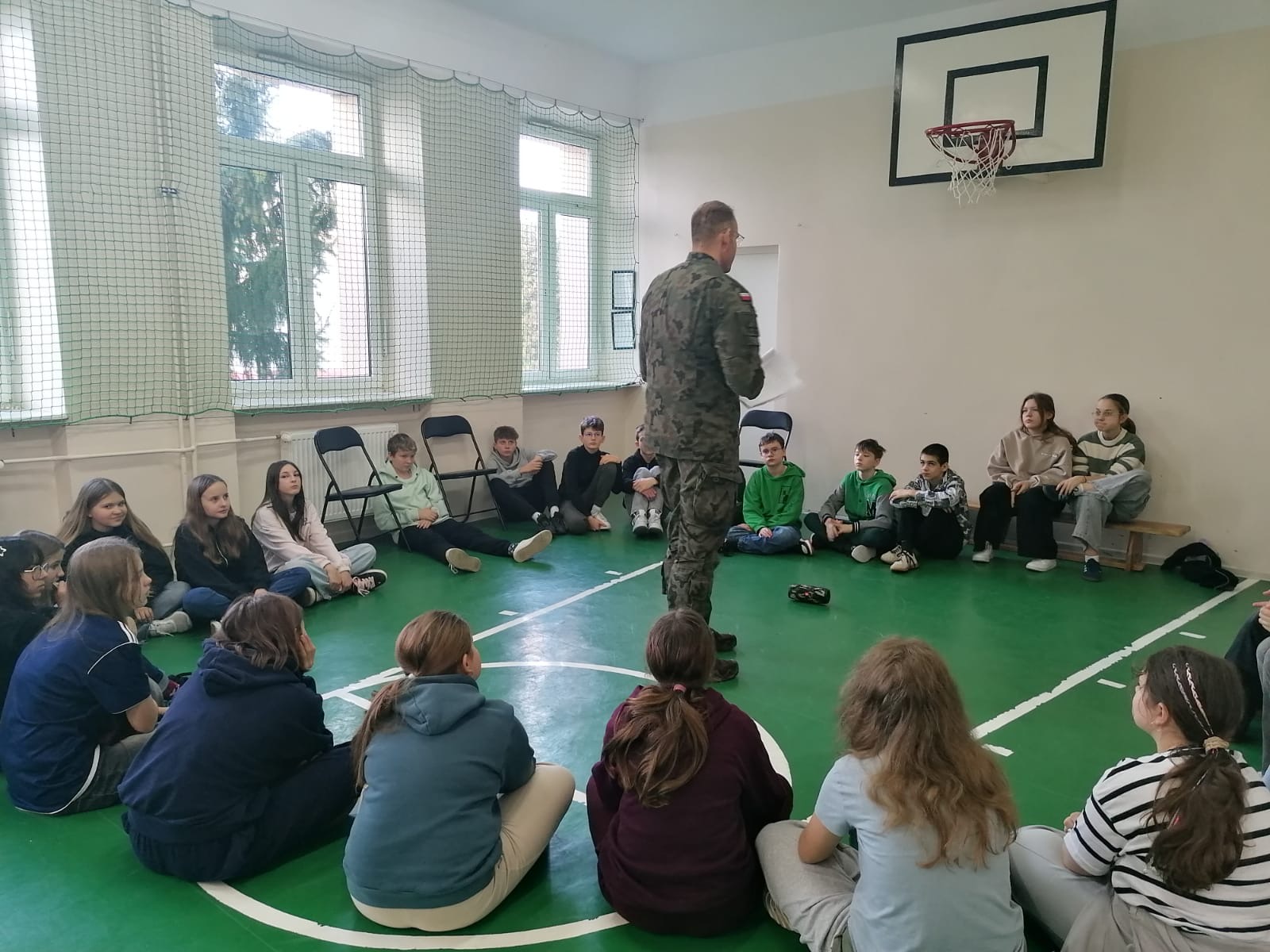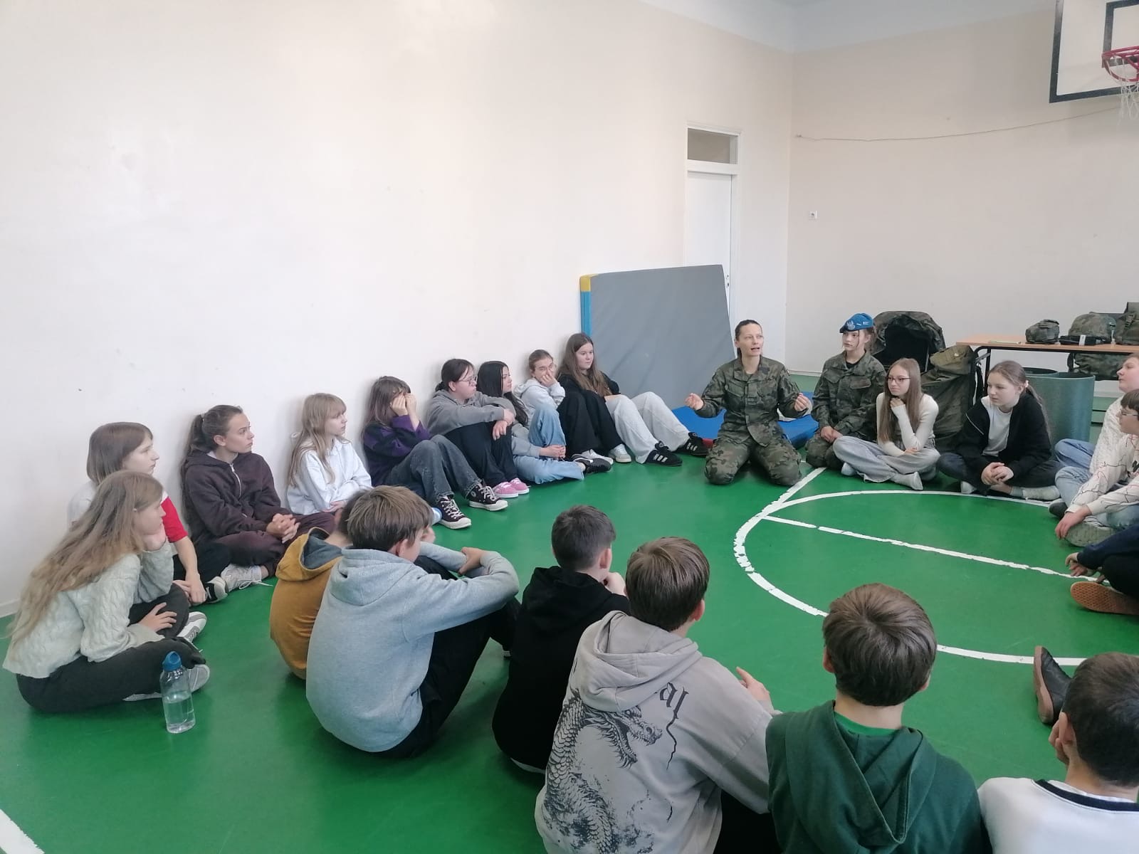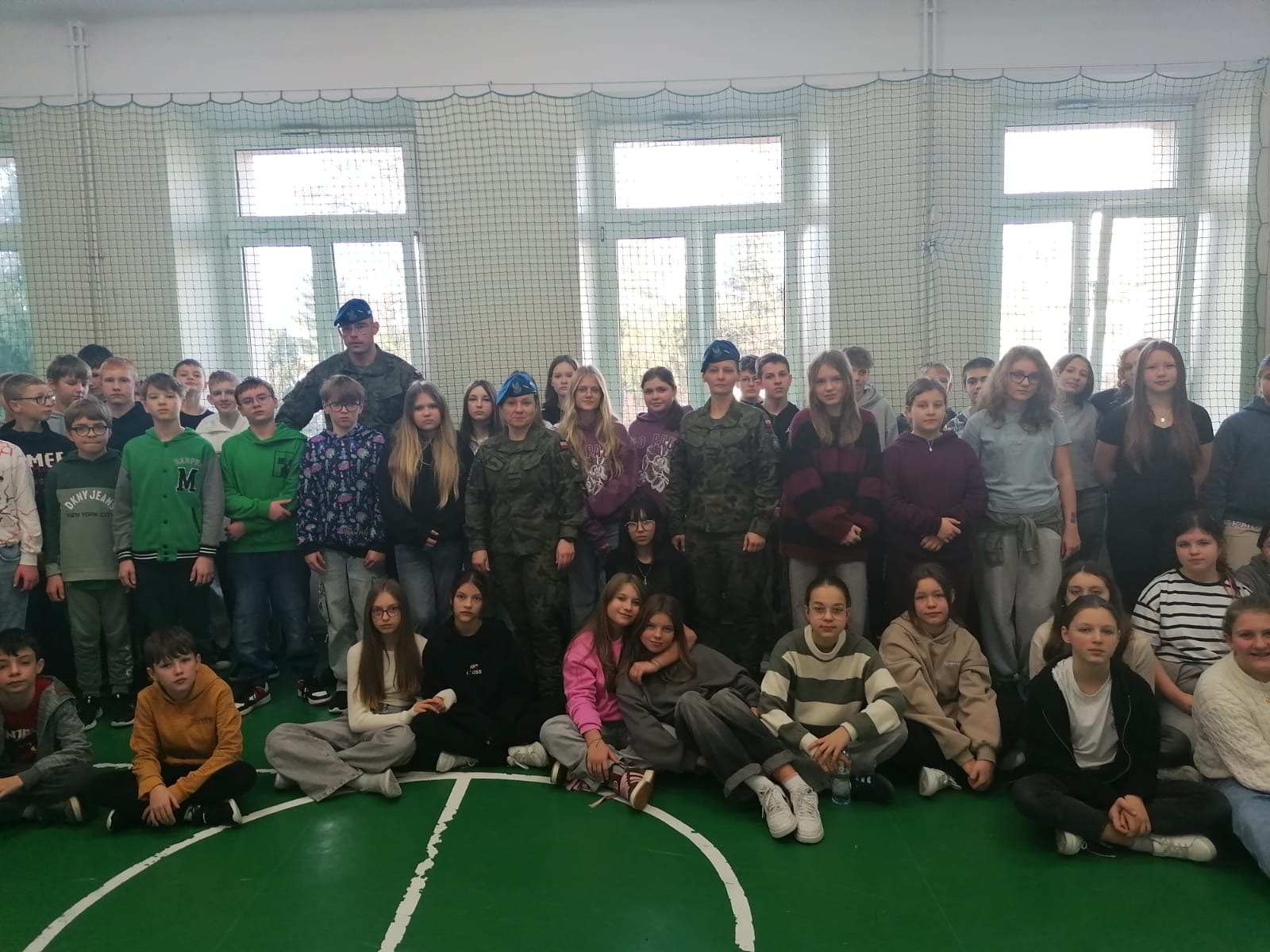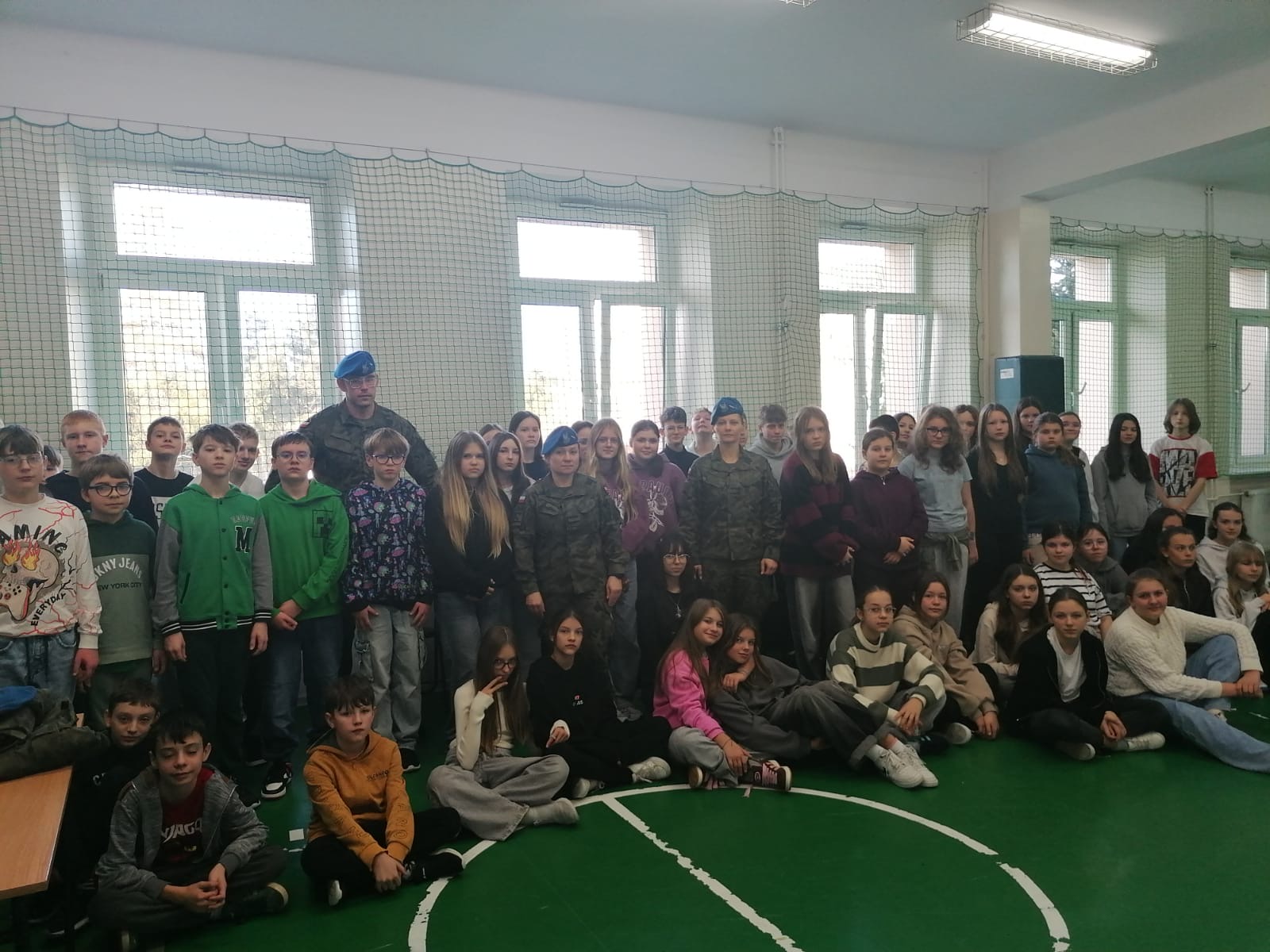 3 grudnia 2025 r. w naszej szkole odbyły się specjalne zajęcia dla uczniów klas 6, prowadzone przez Centrum Przygotowań do Misji Zagranicznych w Kielcach. "Edukacja z Wojskiem" to program przygotowany i realizowany we współdziałaniu Ministerstwa Edukacji Narodowej i Ministerstwa Obrony Narodowej. Szkolenie łączyło teorię i praktykę. Uczniowie zapoznali się m.in. z zasadami alarmowania, sposobami szukania i wzywania pomocy. Uzyskali informacje, jak reagować w sytuacjach kryzysowych, związanych z udzielaniem pierwszej pomocy, cyberprzemocą i cyberprzestępstwem. Mieli okazję nie tylko zdobyć teoretyczną wiedzę, ale wzięli też udział w ćwiczeniach praktycznych. Dzięki takiej formie spotkania z żołnierzami przekonali się, jak ważne jest szybkie i skuteczne działanie w sytuacjach różnych zagrożeń. Dziękujemy za możliwość udziału w takim przedsięwzięciu.
