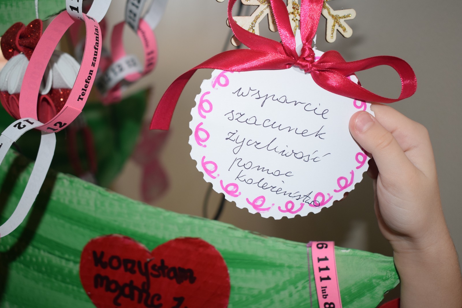 Każda klasa otrzymała jedną – symboliczną – ozdobę, na której miała za zadanie umieścić kilka słów wyrażających miłość, akceptację i szacunek wobec drugiego człowieka. Te proste, a zarazem niezwykle ważne przesłania przypominały, jak wielką moc mają dobre słowa oraz jak bardzo potrafią budować poczucie bezpieczeństwa i wspólnoty w szkolnej społeczności.